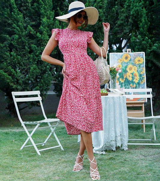 Women Spring Summer Dresses, Floral Crew Neck Ruffle Sleeve Sundress, Holiday Party Long Tiered Dress